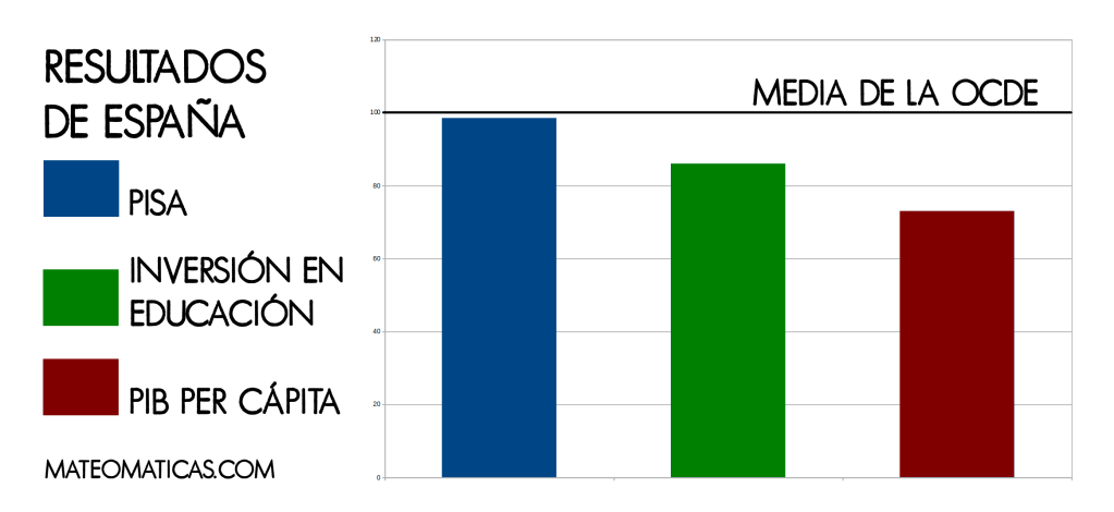 Si observamos los resultados de PISA, queda evidente que España ha obtenido un 1-2% menos que la media de la OCDE, dependiendo de la prueba. Sin embargo, si atendemos al PIB per cápita, observamos que España se encuentra un 27% por debajo del total de la OCDE, y si nos fijamos en la inversión en educación nos encontramos un 14% por debajo. Entonces, ¿por qué hay tanto interés en dibujar los resultados PISA como un fracaso si más bien parece un milagro?