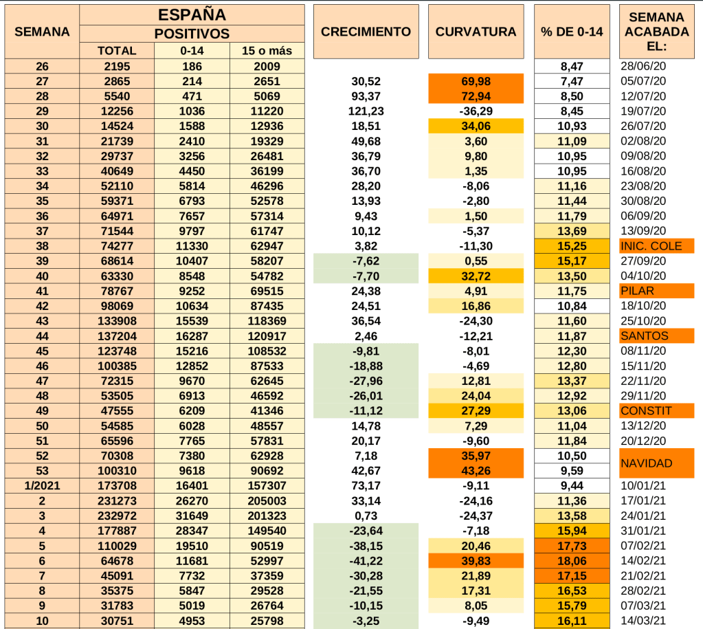 También les dejo un análisis similar con los datos semanales nacionales que nos ofrece el Instituto de Salud Carlos III (enlace). Pierde mucho el no tener los datos diarios, aunque se puede ver cierto paralelismo con los principales acontecimientos de Andalucía (puentes de principio de curso que apenas afectan a la curvatura, porcentajes de menores aún más disparados por relajación de los protocolos, elevación de la curvatura…)