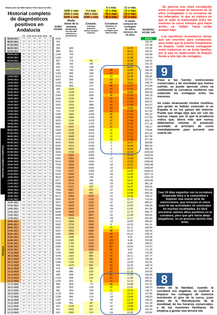 Es alarmante la conexión del índice de menores de 15 años contagiados y la curvatura de los contagios globales. Cada vez que sube lo primero, la curva se retuerce hacia arriba a los dos o tres días, automáticamente, aunque estemos sufriendo las restricciones comerciales y de movilidad más asfixiantes. Pueden verlo aquí más grande (es mejor leerlo desde abajo):