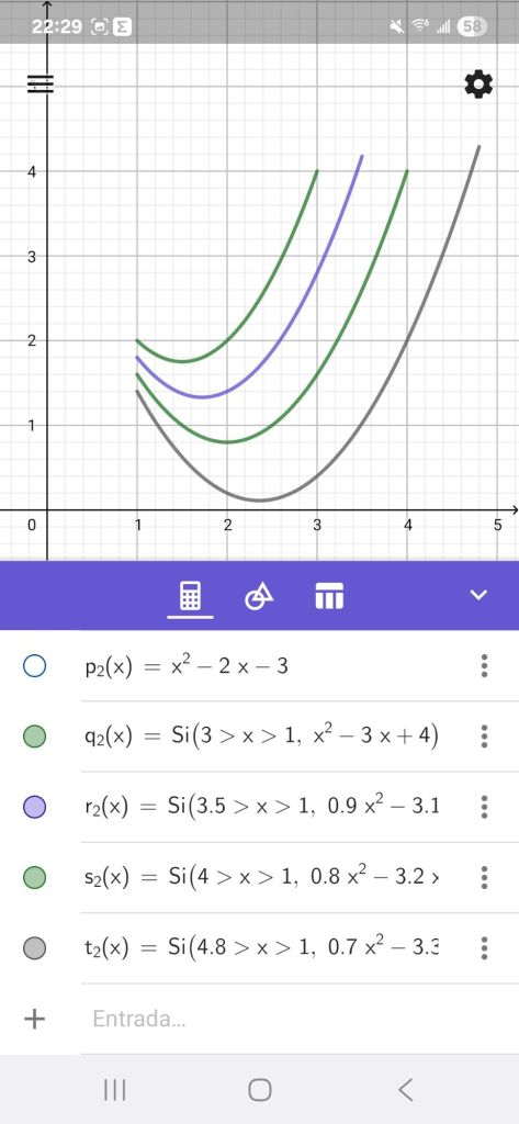 Corte de parábola (pelos): g(x)=Si(2<x<4, x^(2)-3 x+4)