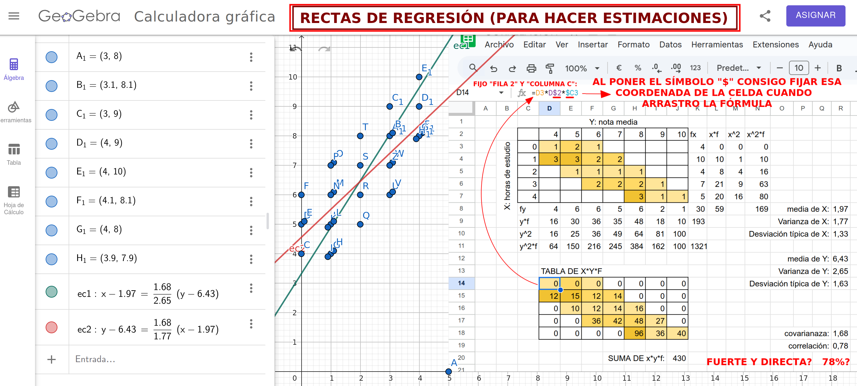 … nos llevamos los resultados a Geogebra y rematamos con las rectas de regresión: